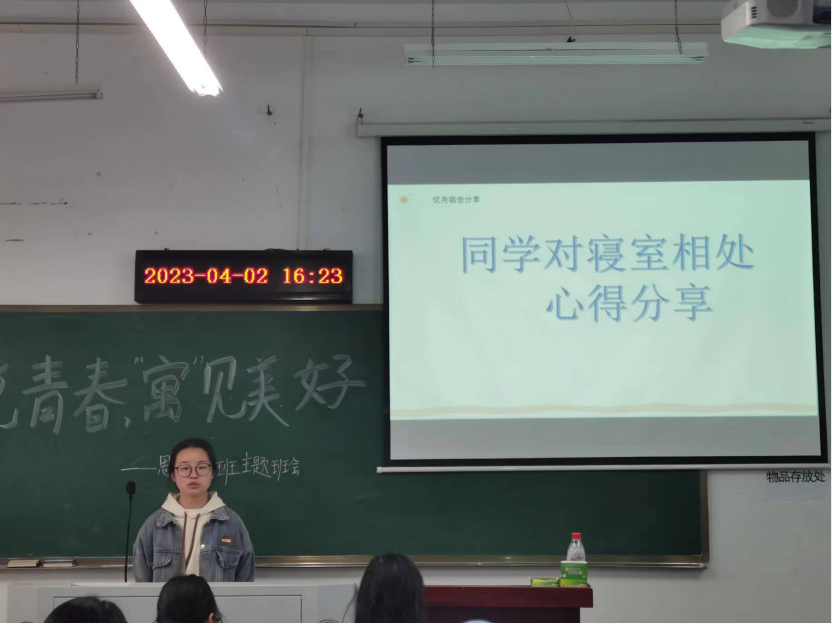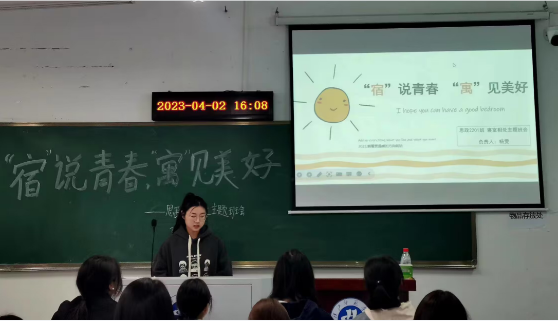4月2日下午,思政2201班杨雯同学在崇文楼A314召开了“宿”说青春,“寓”见美好的主题班会,分别从寝室氛围的重要性、寝室相处之道、优秀寝室分享和诉说寝室相处心得四个环节展开。