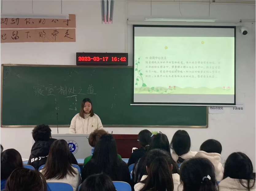 3月17日下午16:30,思政2101班郑思宇同学在崇文楼A310召开“宿舍相处之道”主题班会。她强调了老员工活人际关系的重要性。对于正在学习、成长中的老员工来说,人际交往是生活的基本内容之一。培养良好的人际交往能力,不仅是老员工活的需要,更是将来适应社会的需要的。她还分析了大学宿舍生活中为什么会有矛盾,以及有了矛盾该怎么办,如何更好地进行沟通,号召同学们在生活中做一个善解人意的人。