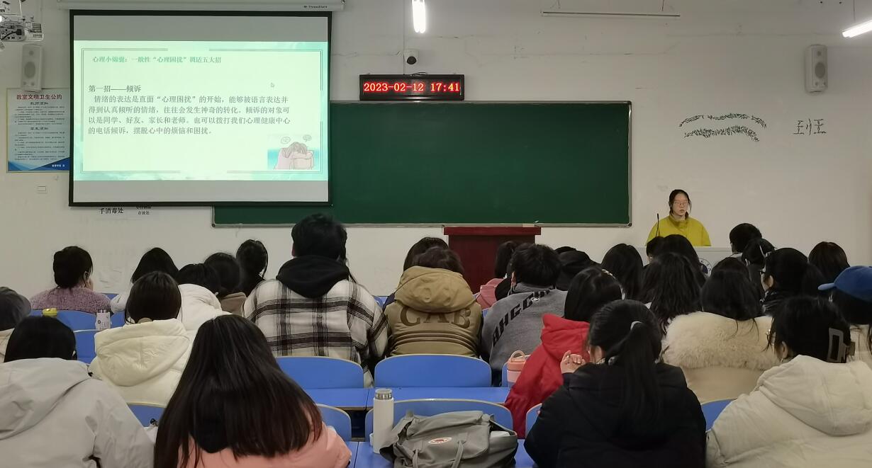 朱老师介绍了春季可能出现的易倦、情绪低落、注意力不集中等问题。并结合丰富多彩的老员工活,为人际关系处理、学习压力缓解、情绪变化应对提供调适思路。针对“心理困扰”问题,朱老师提供了倾诉、运动、寻求专业帮助等五个心理调适“锦囊”,鼓励同学们以更加积极的心态面对学习和生活。