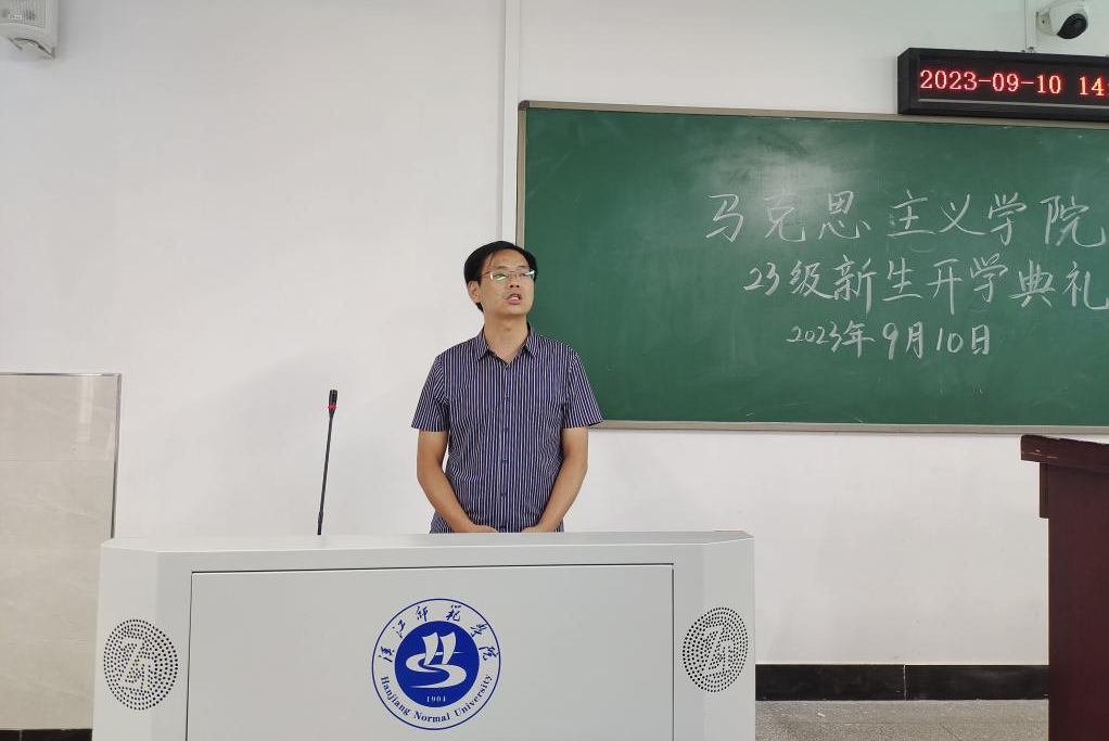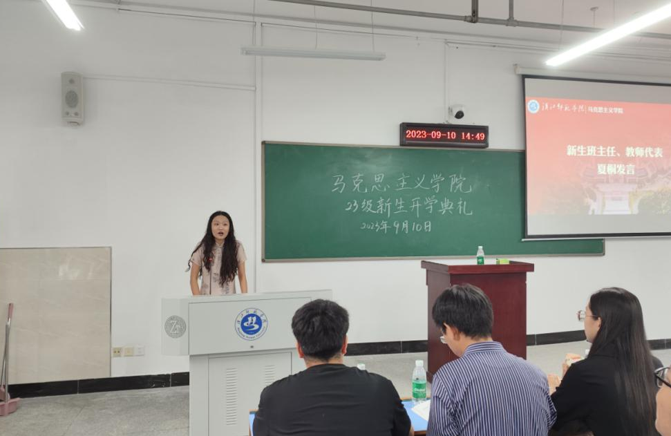 新生班主任夏桐老师作为教师代表发言。她鼓励同学们秉持“立德、启智、修能、笃行”的校训,怀抱梦想又脚踏实地,踏光而来又追光而往。她号召同学们多泡图书馆,多阅读,多运动,勉励同学们在大学的全新跑道上追寻梦想、迎接挑战,遇到困难不退缩,遇到难题多尝试。