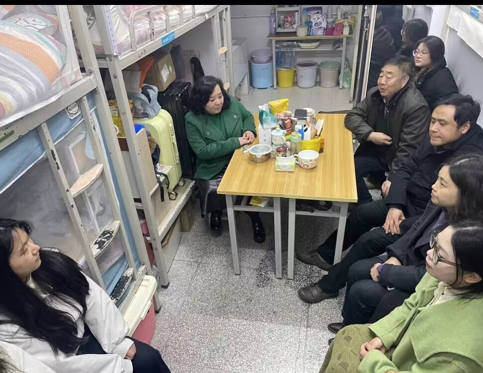 在大四年级党员代表的“星级文明宿舍”,着重关注学业进展与职业发展。针对考研初试后的焦虑情绪,秦经理细致询问考试感受与预估情况并给出针对性建议;围绕毕业论文,老师们了解选题进展、耐心解答疑难,鼓励大家兼顾创新与理论实践结合,严守学术规范;谈及就业,秦经理询问求职意向与困难,介绍形势政策,引导树立正确择业观。走访中,老师们还查看了寝室卫生与安全情况,叮嘱同学们保持环境整洁、筑牢安全底线。