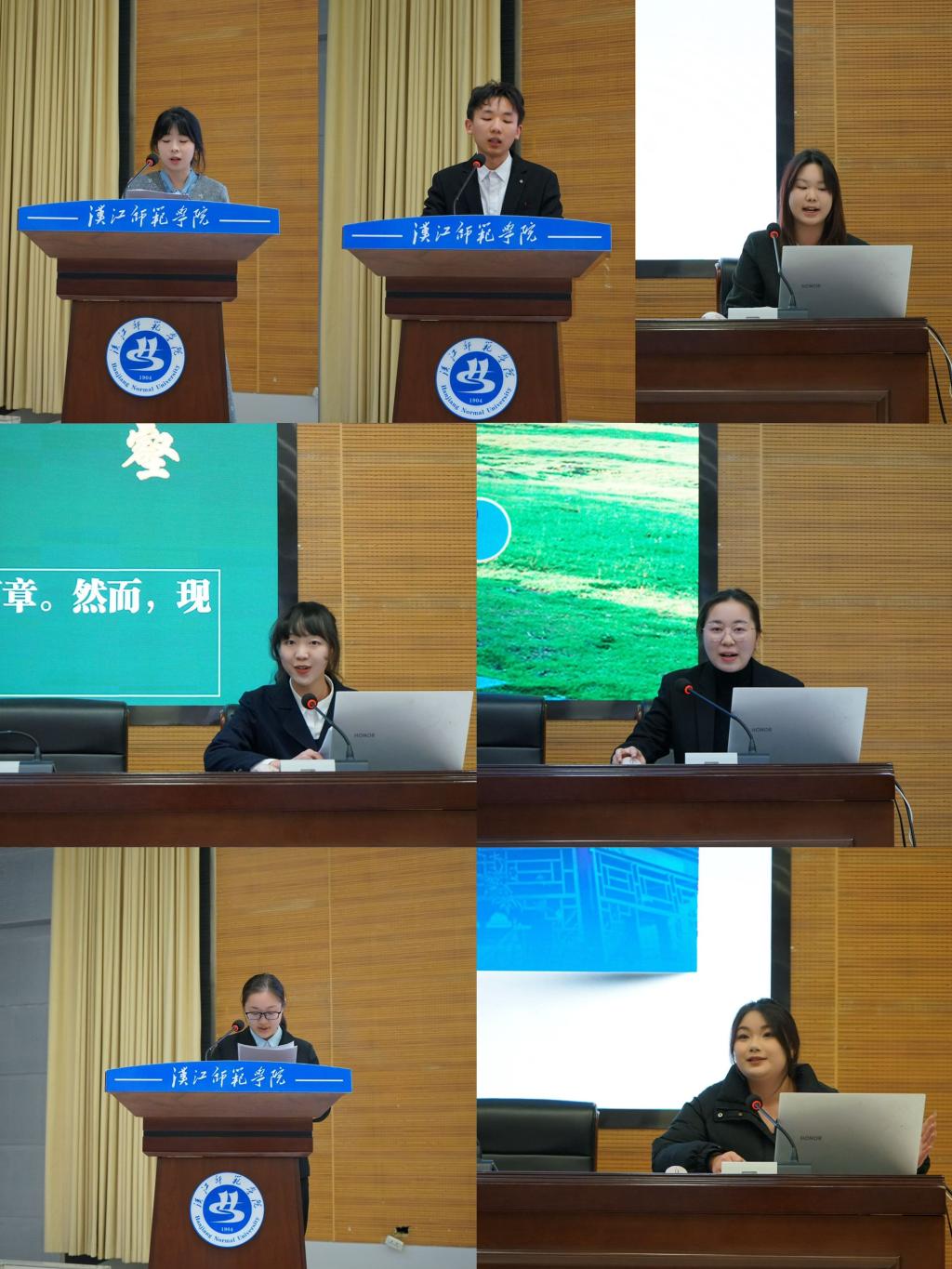 榜样宣讲环节,7位获奖员工依次上台,分享了各自的学习心得与成长经历。谈子琴分享了“跑出成长加速度”的经验,周梦分享了“行动胜过空想”成长实践,张佳玲讲述了坚守初心、努力成才的奋斗故事,万淑芬介绍了一名国奖获得者的学习方法,王家乐、黄心越、邱子涵主要介绍了备战教师技能竞赛的过程、收获和感悟。