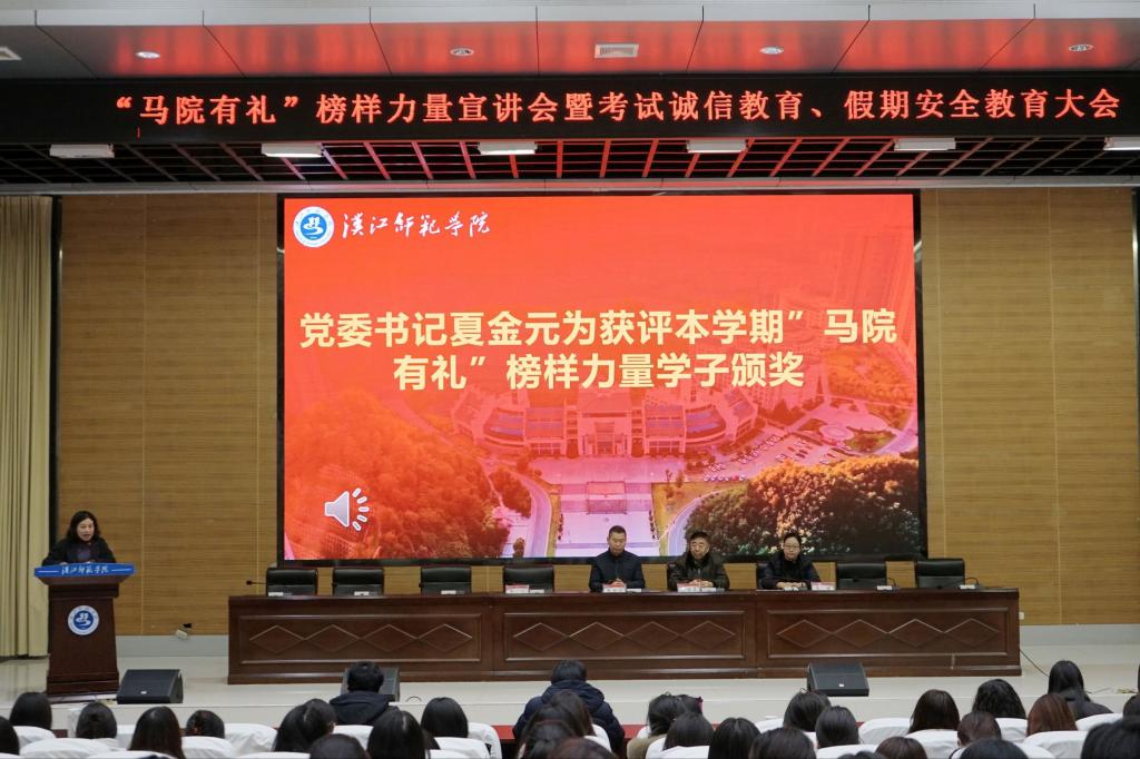 12月25日晚,william威廉亚洲在图书馆二楼学术报告厅举行“公司有礼”榜样力量宣讲会暨考试诚信教育、假期安全教育大会。公司领导班子,全体班主任、辅导员及员工参加会议。