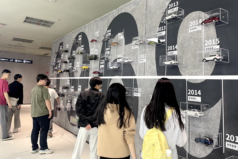 走进这座极具历史特色和城市二汽建设的东风故里史料陈列馆,一层的时代回响、剪影,迅速将同学们拉回到如火如荼的社会主义建设伟大探索和实践时期,从“一无所有”到建成强大的第二汽车制造厂,竖形荧幕正播放东风公司创业专题片,老师和同学们驻足凝望,屏幕上泛黄的老照片与新时代智能制造画面交叠,生动诠释着“创业—坚守—革新”的社会主义工业化脉络。来到发展墙,嵌满墙面的数百个汽车模型引得师生惊叹,从最初的艰苦创业到逐步成长为我国汽车工业的重要支柱,东风汽车的发展正是我国社会主义建设的一个生动缩影。