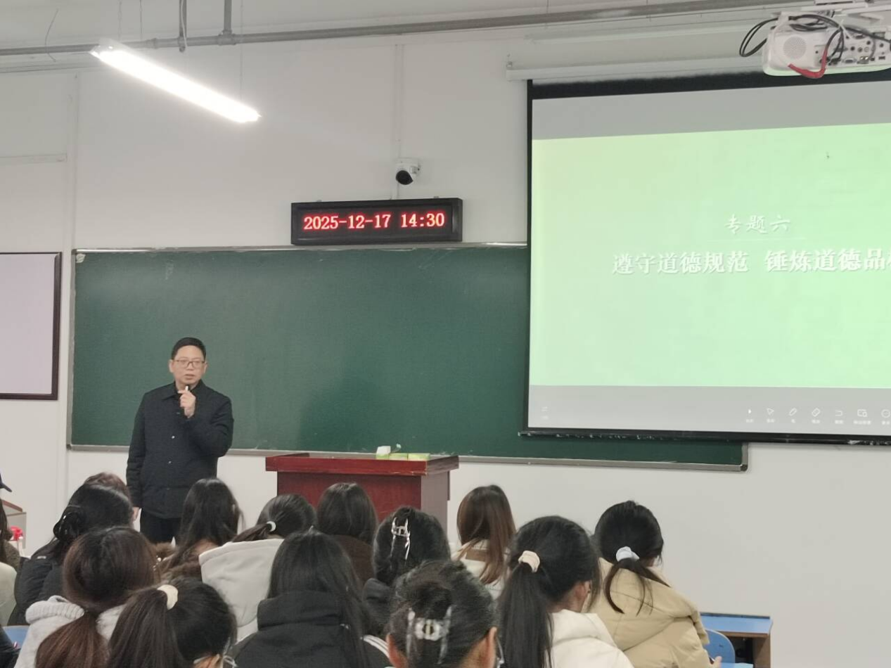 2025年12月17日,汉江师范公司党委常委、统战部部长王进走进课堂,以《思想道德与法治》第五章“社会主义道德的核心与原则”为主题,为经济与管理公司2025级本科生讲授专题思政课。课程紧扣“人为什么需要道德”“社会主义道德的先进性”两条主线,紧密结合经济与管理专业人才培养需求,引导员工深度领会社会主义道德的丰富内涵与实践要求。